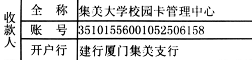 3、工本费缴交方式:申办单位将工本费总额(10元/张)转账(备注单位名称和人数)到财务处账户(见下方),持缴款凭据到财务处后勤基建科领取转账缴费凭据,并将凭据复印件交至校园卡管理中心。
