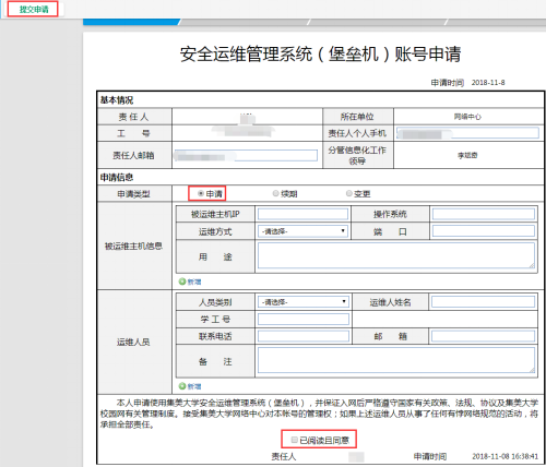 2、在申请类型中选择“申请”,输入被运维主机IP、操作系统、运维方式、端口、用途等信息,如要添加多台主机,点击新增;输入运维人员类别、姓名、学工号等信息,如要添加多名运维人员,点击新增。阅读相关规定后勾选同意,提交申请。