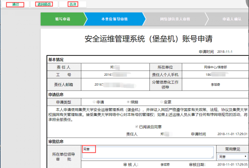 领导填写审批意见后选择通过、退回修改或否决。通过后由网络部负责人办理,并通过邮箱发送“系统账号、密码和《运维安全管理系统(堡垒机)使用指南》”回复用户,请注意查收;退回修改后需重新提交并由领导审核通过;否决流程结束。