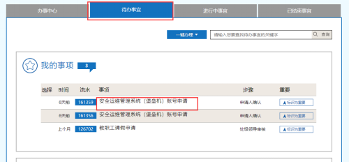 3、分管信息化领导审批:在浏览器中打开http://flow.jmu.edu.cn,使用“i集大”(账号密码)登录,选择“待办事宜”——“我的事项”——“安全运维管理系统(堡垒机)账号申请”。