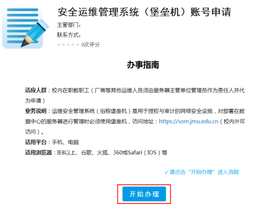 1、申请人登录一表通系统(http://flow.jmu.edu.cn/),选择“服务中心”-“网信办”-“安全运维管理系统(堡垒机)账号申请”-“开始办理”进入流程开始申请办理。