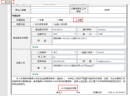 2、申请类型选择“变更”,在主机用途填写主机变更信息,在运维人员备注填写人员变更信息,阅读相关规定后勾选同意,提交申请。