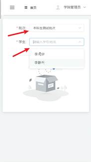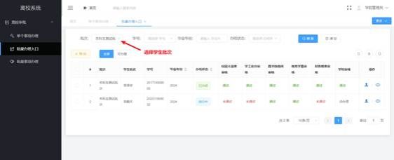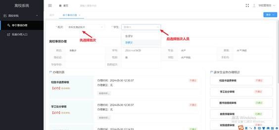 功能1:单个事项办理入口,先选择离校学生批次,再选择学生