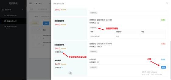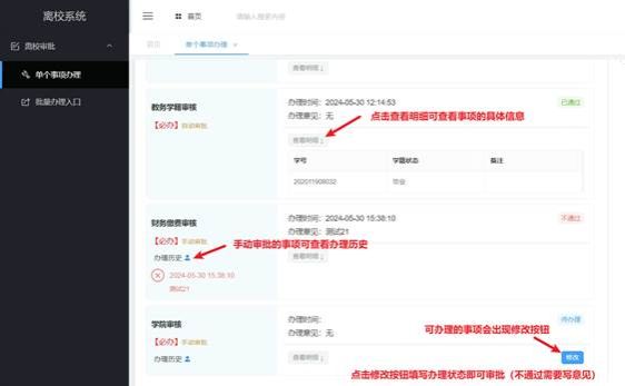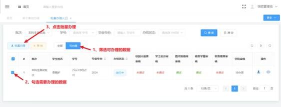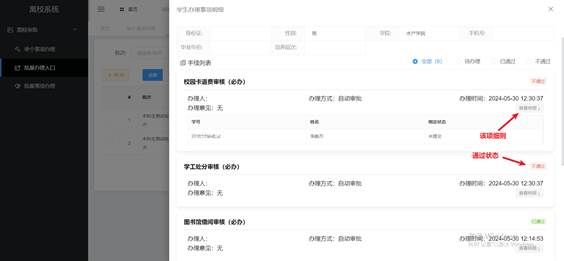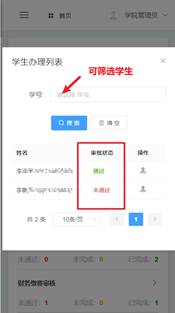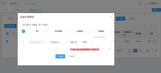 勾选多个学生,点击批量办理,选择通过状态,即可实现批量学生的离校事项审批。