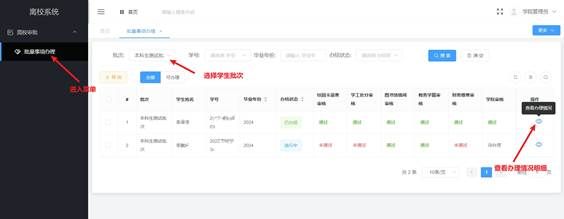进入页面后,选择学生批次,即可查看学生离校项目各项情况。