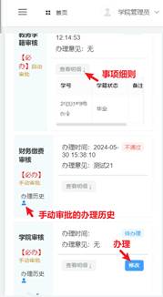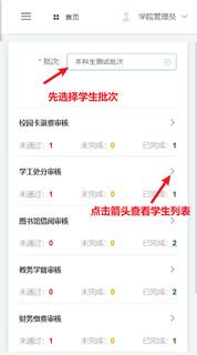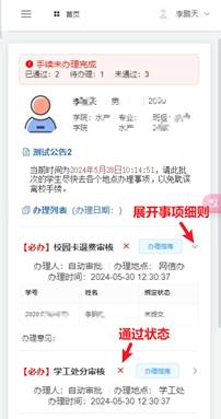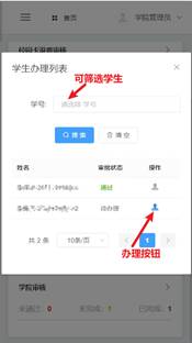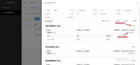 每个学生列表有两个图标,可进行单个学生审批和查看该生离校细则