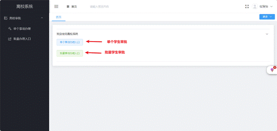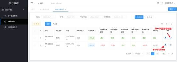 点击【单个事项办理入口】,可进入单个学生的离校事项办理页面中点击【批量事项办理入口】,可进入批量学生的离校事项办理页面中。