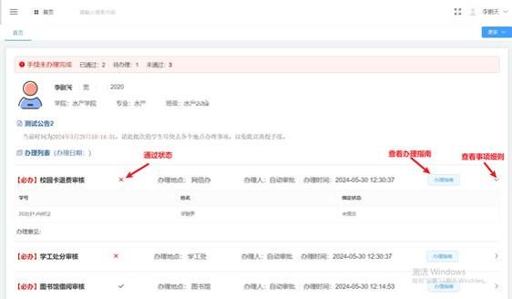 进入页面后,可以查看批次公告和自己离校事项的通过情况,点击“办事指南” 可以查看该事项如何办理;点击“>”可查看每项的具体数据。