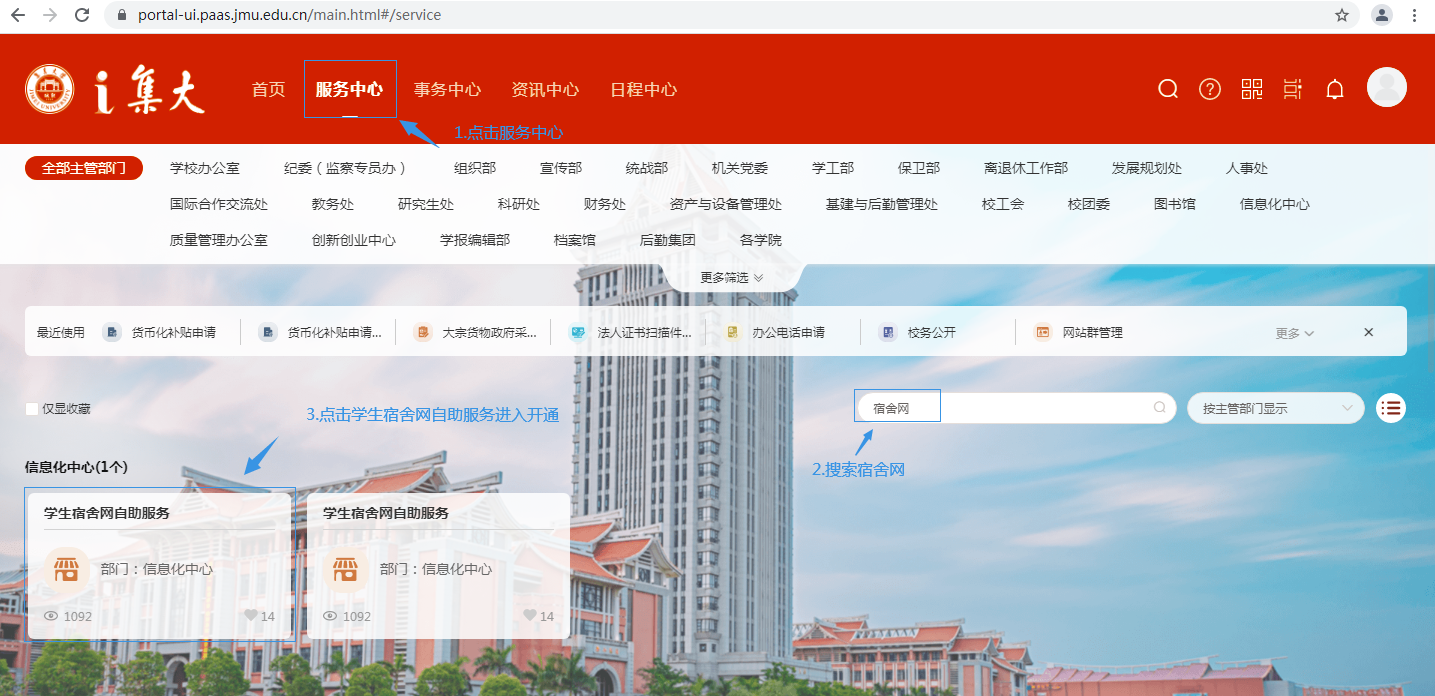 登入i集大(i.jmu.edu.cn),点击“服务中心”搜索“宿舍网”,点击“学生宿舍网自助服务”进入网上营业厅,通过支付宝进行充值开户、续费。