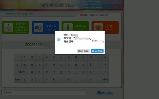 【温馨提示】将校园卡放到感应区后,请勿移开卡片,直到读取成功后,方可取走卡片,读卡有效时间20秒。