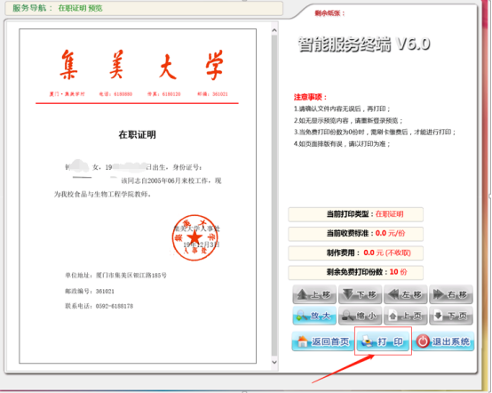【预览文件】登进入预览打印界面后,预览当前打印项目的效果,您可以对预览图进行操作:放大、缩小、上移、下移、左移、右移。当打印项目出现多页的情况,可以点击上一页、下一页进行浏览。